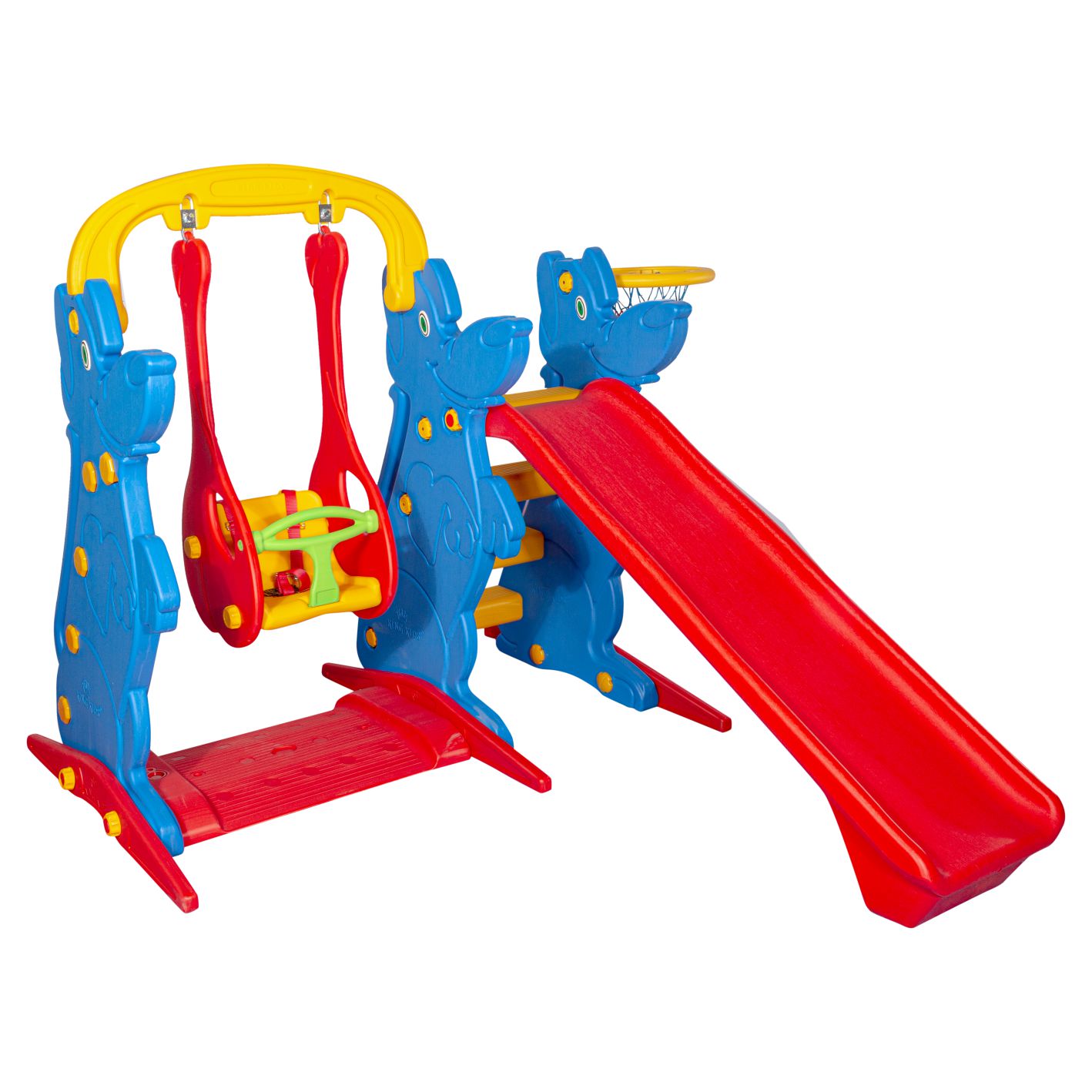 Columpio con tobogán y canasta